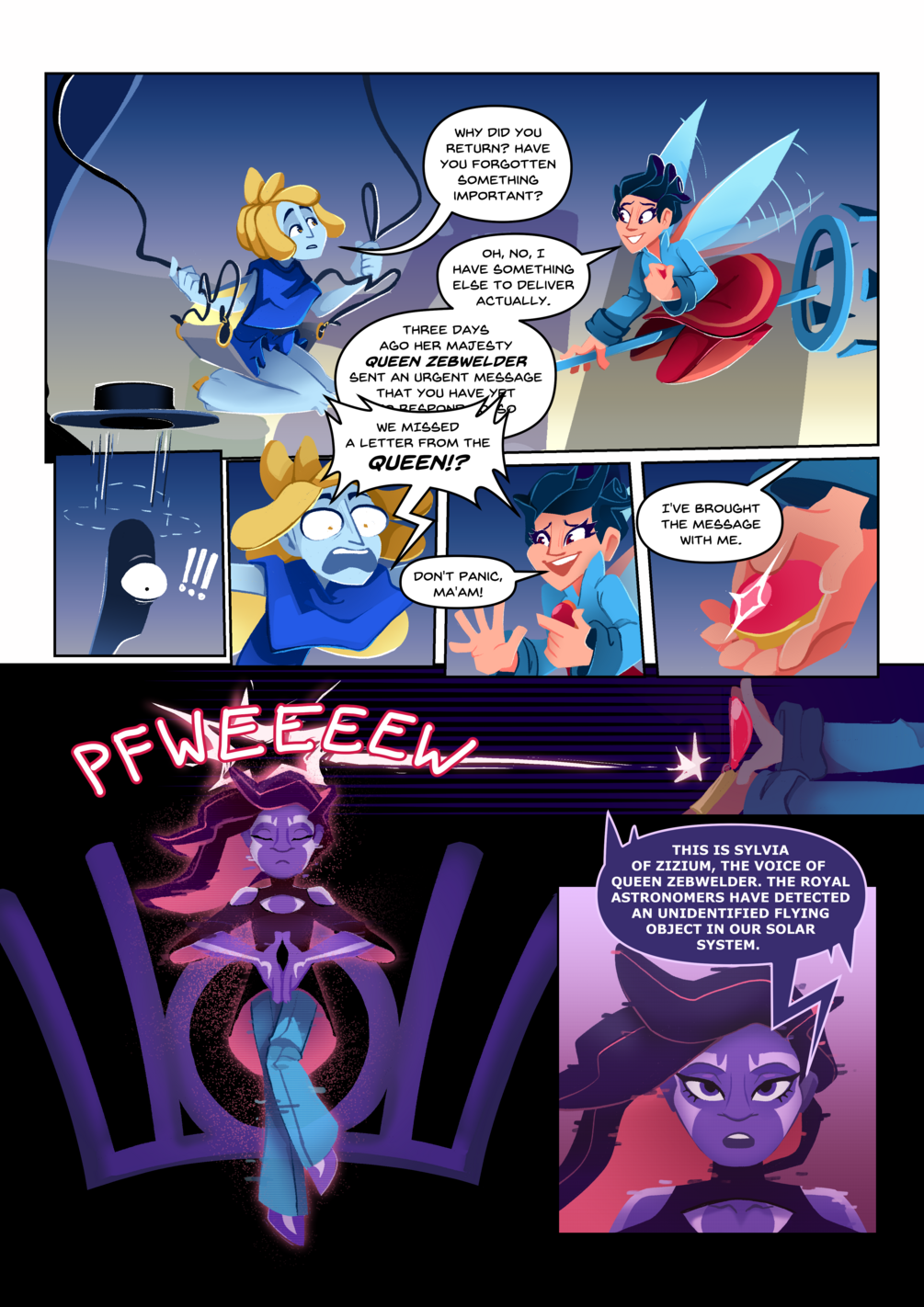 Follow the friendly mail-fairy Karlyn on her quest to see the world, meet new people, and get everyone on her mailing list to respond to the urgent message from their Queen! In the first pilot issue, Karlyn helps Niya, a fairy scared of heights, get to the nearest post office which is in space.